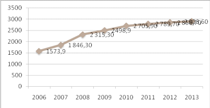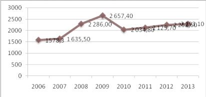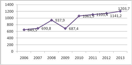 Из рисунка 8 видно, что поступления налога на доходы физических лиц (НДФЛ) растут постепенно. Если сравнить прогнозируемый 2013 г. с 2006 г. то ожидается, что в 2013г налоговые поступления увеличатся на 84% по сравнению с тем же 2006 годом.