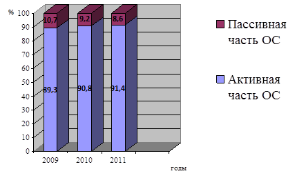 Рис. 3. Динамика соотношения активной и пассивной частей основных фондов ООО «БСХР» за 2009-2011 гг.