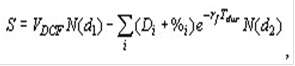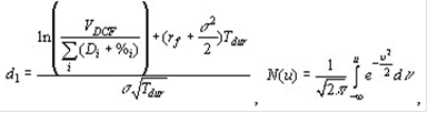 где VDCF - оценка стоимости компании, полученная, скажем, следуя модели DCF (или иной возможной при конкретных исходных данных); - суммарная величина основного долга и процентных платежей (или купонных выплат); Tdur - средневзвешенная дюрация долга; rf - безрисковая процентная ставка, соответствующая длительности T;