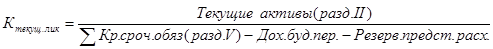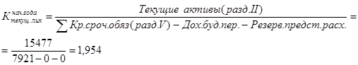 3) Рассчитаем коэффициент текущей ликвидности. Коэффициент текущей ликвидности - отношение общих текущих активов к краткосрочным обязательствам (текущим пассивам). Этот коэффициент используется для определения платежеспособности предприятия. Нормальным считается значение коэффициента от 1,5 до 2,5 в зависимости от отрасли. [12, 262]