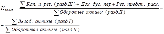 4) Коэффициент обеспеченности собственными оборотными средствами - относится к коэффициентам финансовой устойчивости предприятия. Характеризует наличие у предприятия собственных оборотных средств, необходимых для его финансовой устойчивости. Рассчитывается по следующей формуле [12, 276]: