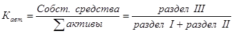 ) Коэффициент автономии - характеристика устойчивости финансового состояния предприятия, характеризующая степень его финансовой независимости. Показывает удельный вес собственных средств в общей сумме источников финансирования. Коэффициент автономии есть отношение собственных средств к общей сумме активов. Рассчитывается по следующей формуле: [12, 279]