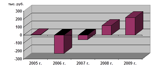 Согласно данным таблицы 4, особое внимание на себя обращает исключительная вариабельность величины собственных оборотных средств. В стабильно работающей фирме такого не может быть по определению. В 2005 г. этот показатель был низким, 2006 и 2007 гг. его величина вообще была отрицательной. Это означает, что предприятие должно ликвидировать свои внеоборотные активы, чтобы суметь расплатиться по свои краткосрочным обязательствам. В нормальной экономике подобная ситуация рассматривается как предбанкротная. Однако в 2008 г. величина собственных оборотных средств не только становится положительной, но и возрастает по сравнению с 2005 г., что является благоприятным фактором. В 2009 г. рост показателя продолжается.