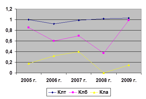 Коэффициент абсолютной ликвидности показывает, что в 2005 г. организация могла оплатить 17% своих краткосрочных обязательств, в 2006г. - 33%, а 2009 г. -15%, что является недостаточным. Динамика коэффициентов ликвидности представлена на рисунке 6.