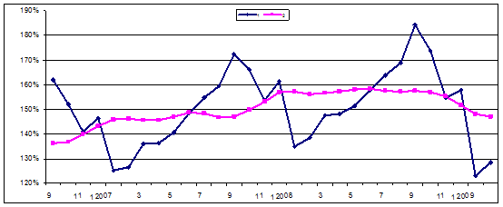 Диаграмма 12.1.1 Динамика ВВП с исключением сезонной и календарной составляющих (2) и без исключения (1), (январь 1995 г. (2) - 100%)