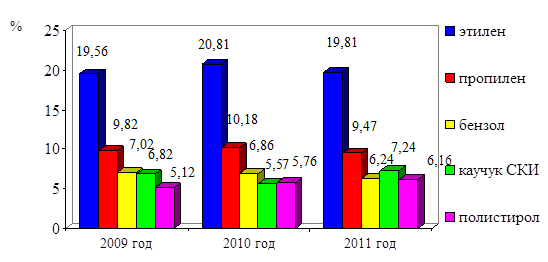 Анализ таблицы 2.1.2 показал, что за 2009-2011 гг. на предприятии ОАО «Нефтекамскхимпром» наблюдается снижение доли производства каучука СКЭПТ, пропилена, бензола, стирола, тримеров пропилена, тетрамеров пропилена и неонолов. По остальной продукции предприятия ОАО «Нефтекамскхимпром» за 2009-2011 гг. наблюдается увеличение удельного веса.