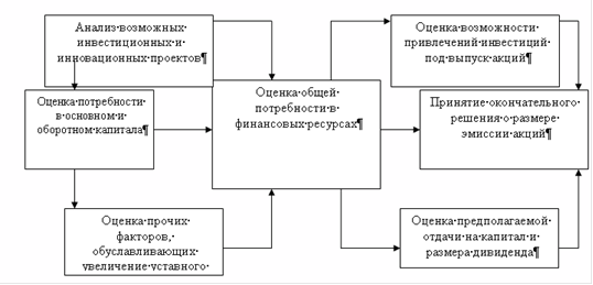 Поскольку на практике с помощью эмиссии акций пытаются решить одновременно несколько задач, конкретный «вес» критериев должен определяться экспертным путем перед каждой эмиссией в отдельности. Общая схема определения размера эмиссии акций представлена на рис. 5.