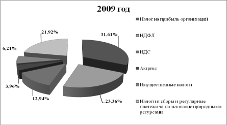 В 2009 г и 2011 г третье место по объему отчислений составили налоги и сборы и регулярные платежи за пользование природными ресурсами - 21,92%, в 2010 это место занял налог на добавленную стоимость - 19, 19%. Доли остальных платежей значительно меньше.