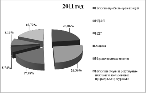 Таким образом, явное долевое лидерство налога на прибыль в 2009 году в размере 31,61% в общей сумме налоговых отчислений, сменилось в 2010 г и 2011 г лидерством НДФЛ, в размере 29,24% и 26,36% соответственно. В 2009 году НДФЛ являлся вторым по объему налогом в общей сумме отчислений и составлял 23,36%. Доля налога на прибыль в 2010 и 2011 году составляет 20,11% и 23,06% соответственно.