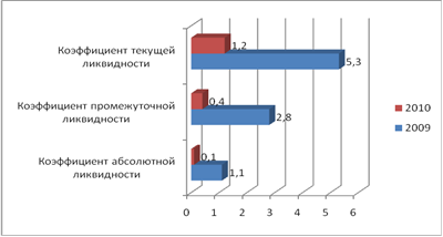 Коэффициент абсолютной ликвидности в 2009 и в 2010 гг. удовлетворяет норме. Однако в 2010 г. наблюдается снижение данного показателя до минимума. Однако, по полученным данным можно утверждать, что предприятие в случае необходимости сможет погасить в ближайшее время краткосрочную задолженность за счёт денежных средств и краткосрочных ценных бумаг.