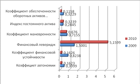 В целом, можно сказать, что предприятие в 2009 г. было финансово устойчиво, но по состоянию на 2010 г. ситуация кардинально меняется, предприятие становится финансово не устойчивым, зависимым от кредиторов, причем зависимость усиливается. Однако, как положительный момент, предприятие имеет большую часть собственных средств в оборотных активах и может свободно маневрировать капиталом. Т.е. у исследуемого предприятия все еще сохраняется возможность восстановления равновесия за счет пополнения источников собственных средств, сокращения дебиторской задолженности, ускорения оборачиваемости запасов.