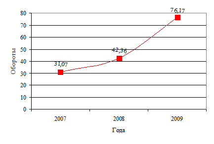 Рис.7. Динамика изменения коэффициента оборачиваемости запасов ООО "АУТТ-3" за 2007 - 2009 гг., в оборотах